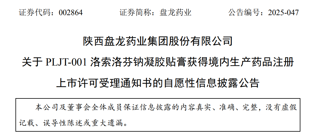 盤(pán)龍藥業(yè)PLJT-001洛索洛芬鈉凝膠貼膏上市申請(qǐng)獲受理,鎮(zhèn)痛新藥研發(fā)再提速